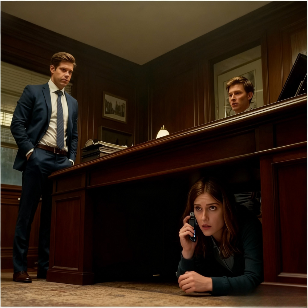 Voices in the hall—Blake and Cameron, early. I dove under the desk, heart thundering like Times Square on New Year’s. They entered, chairs scraping. “Should’ve moved faster,” Cameron snapped. “That bank stunt nearly blew it.”